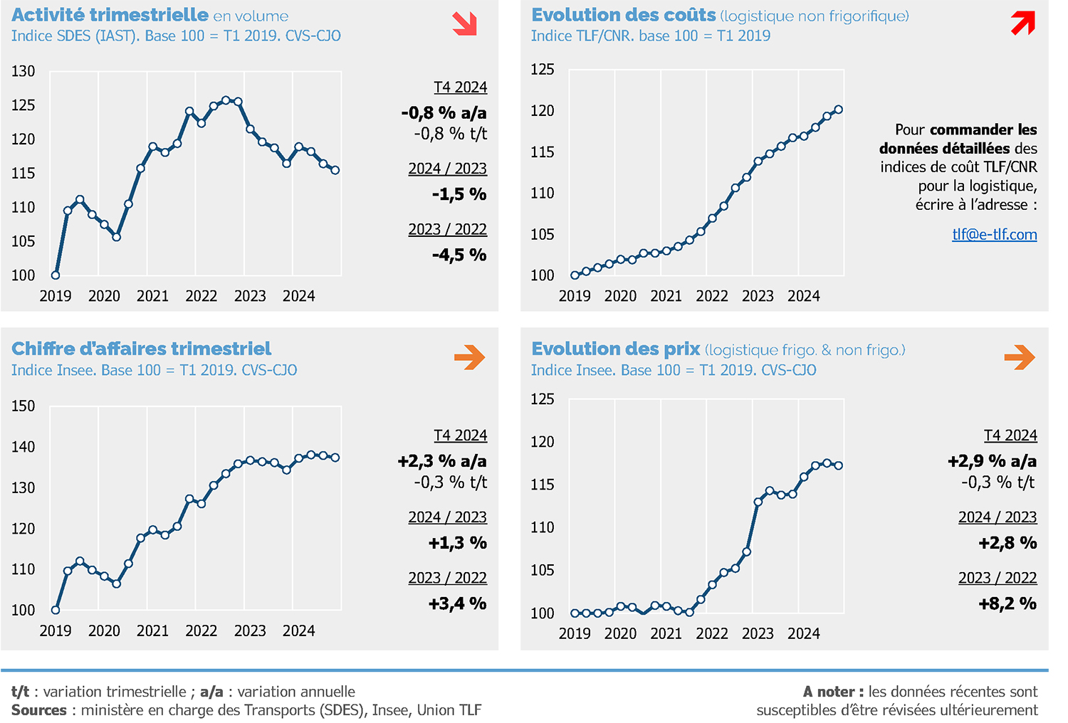 La publication statistique du ministère des Transports, en date du 17 avril 2025, renseigne une baisse d’activité de 0,8 % sur un an au 4e trimestre. Sur l’ensemble de l’année, le recul atteint ainsi 1,5 % comparativement à l’année précédente, et -5,9 % sur deux ans. « C’est là le pendant d’une consommation française en biens encore à la peine », exprime l’Union TLF dans un communiqué. L’indice des coûts d’exploitation des entrepôts, produit par le Comité National Routier (CNR) en partenariat avec l’Union TLF, progresse une fois encore plus rapidement que l’inflation générale des prix à la consommation. Au 4e trimestre, les charges logistiques se sont alourdies de 2,9 % sur un an ; tandis que l’inflation française s’est réduite à 1,3 %.
